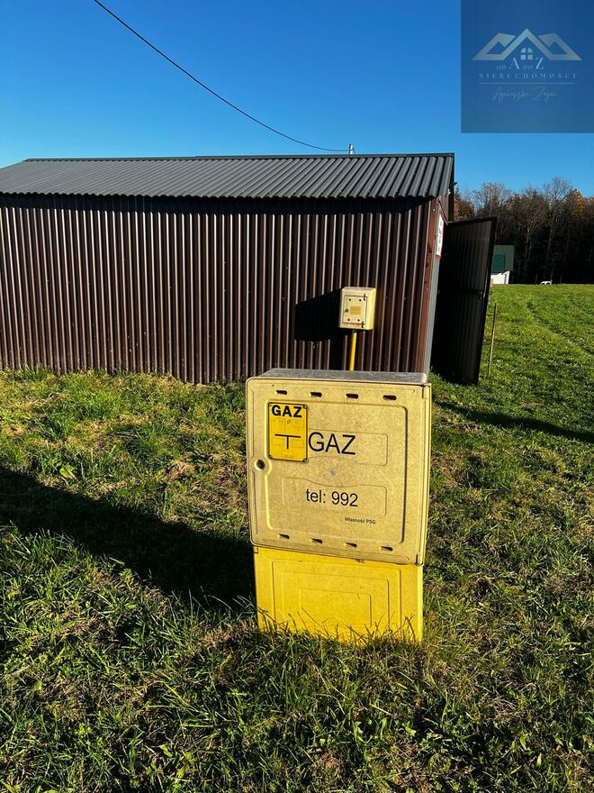 Na działce znajduje się budynek gospodarczy, do którego doprowadzony jest prąd oraz skrzynka z gazem.
